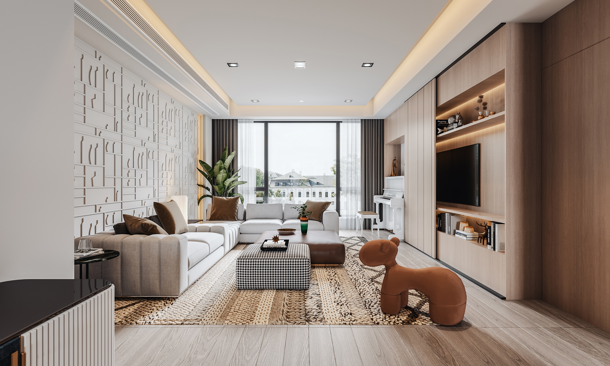 現代輕奢風是一種融合了現代元素和奢華感的室內設計風格,注重材質的質感、線條的簡潔、空間的通透和光影的變幻。