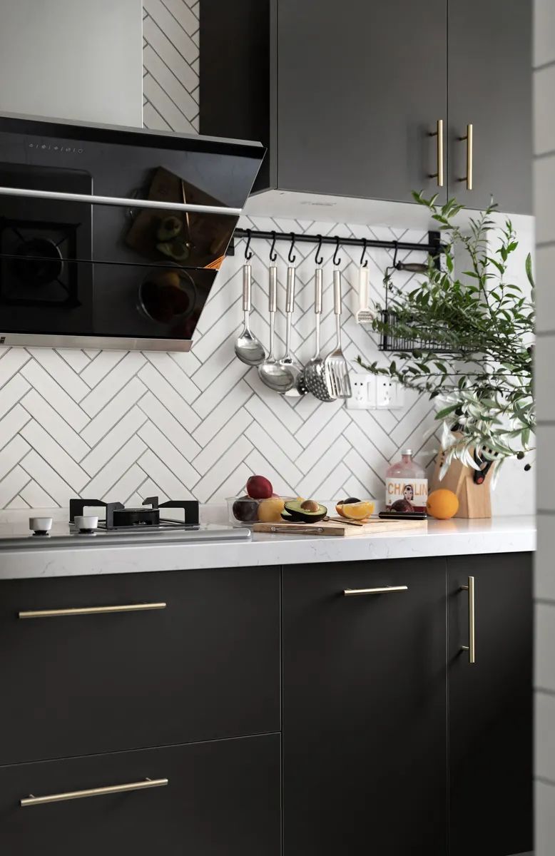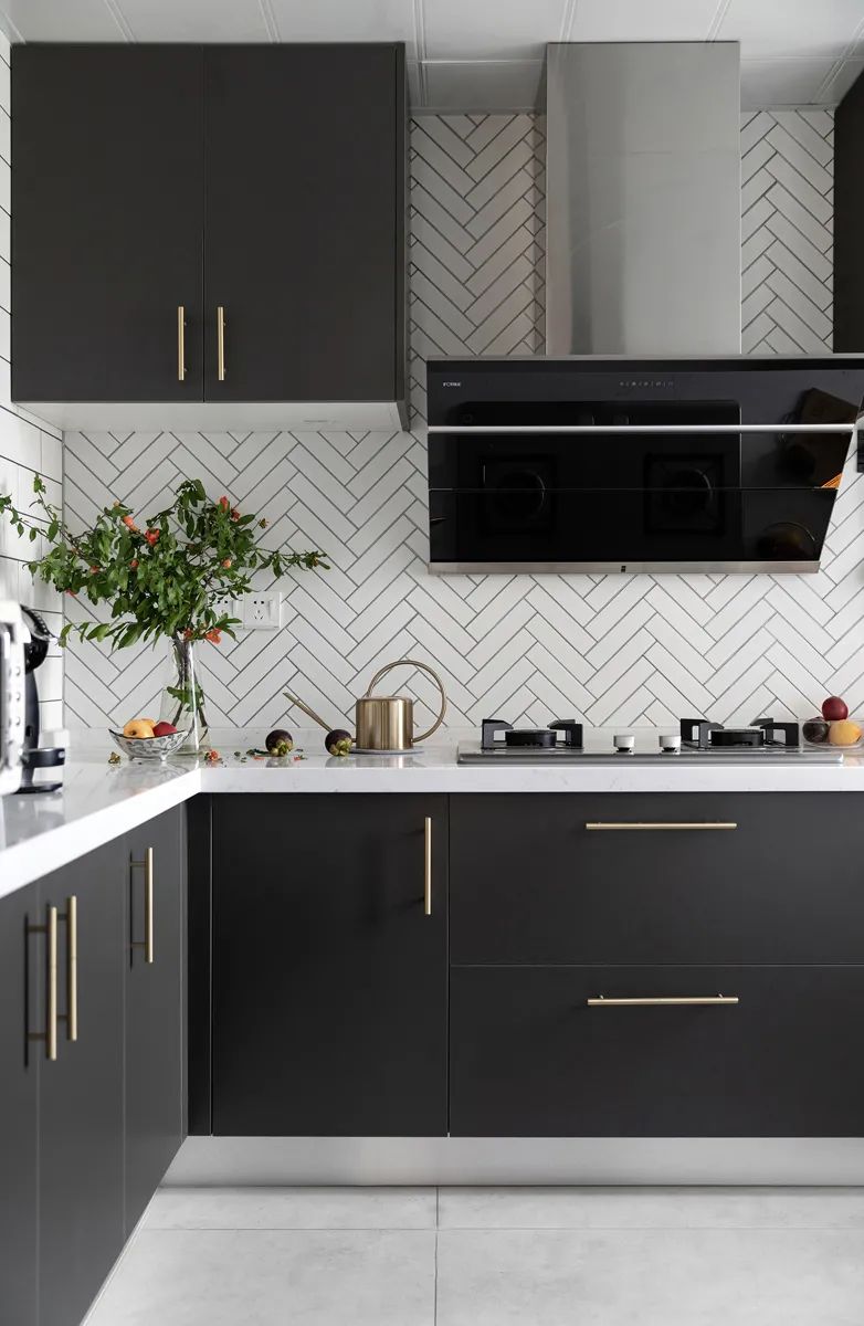 耀黑色餐柜面板氣質(zhì)出眾,摻揉黃銅色澤把手將精致生活的理念用心描摹,矩形瓷磚不拘謹(jǐn)在常態(tài)之內(nèi),沿著廚房輪廓幾何鋪貼,相同的材質(zhì)呈現(xiàn)不同的趣意,渲染出居家時(shí)刻的優(yōu)雅氣息。