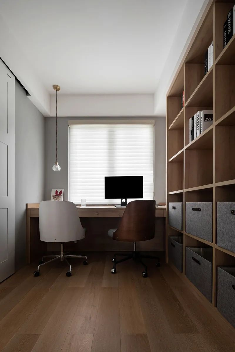書房設(shè)計(jì)簡約通透,整面木格書柜能將不同書籍分門別類,也能擺放定格著生活記憶的照片或裝飾品,獎(jiǎng)杯等,在彰顯人文內(nèi)涵之外,增強(qiáng)屋主對家的依賴與好感。
