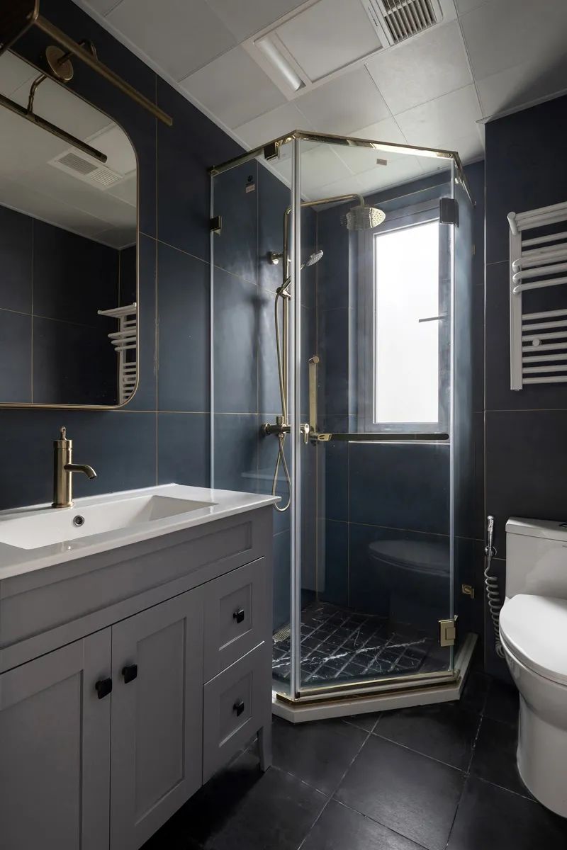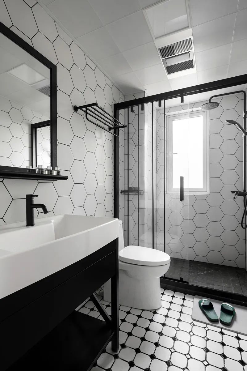 主衛(wèi)浴設(shè)計(jì)更像一件藝術(shù)品,六邊形白色瓷磚在墻面烘托出怦然心動(dòng)的時(shí)尚感,地磚與洗手臺在似黑非白中游走,玻璃推拉門讓室內(nèi)通透感與干濕分離的功能性更為合拍,演繹出精致生活。