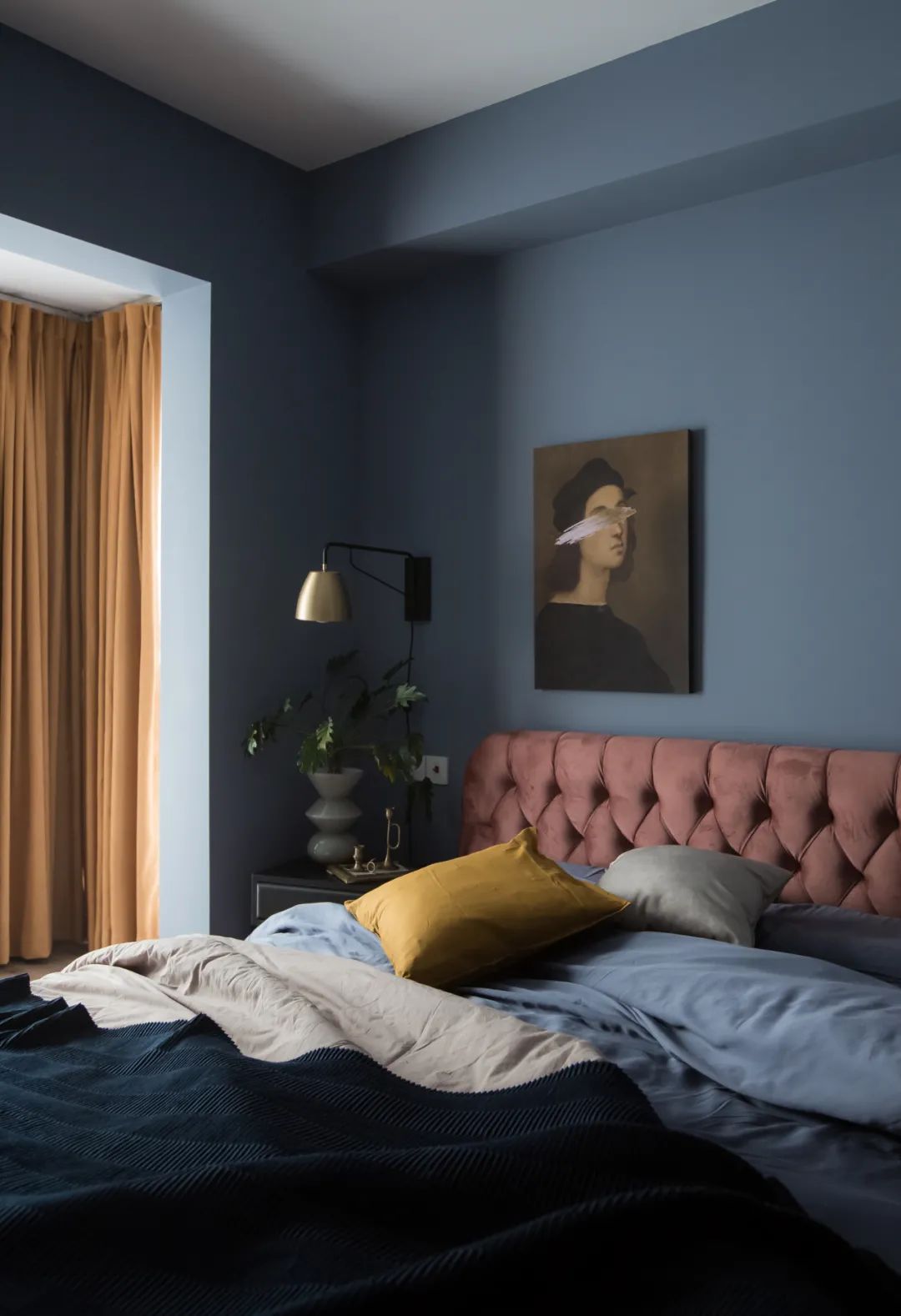● 臥室讓冷靜的克萊因藍與熱辣的芥末黃形成鮮明視覺對比,在強烈而舒適的對比下衍生藝術(shù)腔調(diào),油畫掛在床頭如海般靜謐的克萊因藍之中渲染氛圍,讓屋主在起居間感受藝術(shù)感賦予生活的精致。