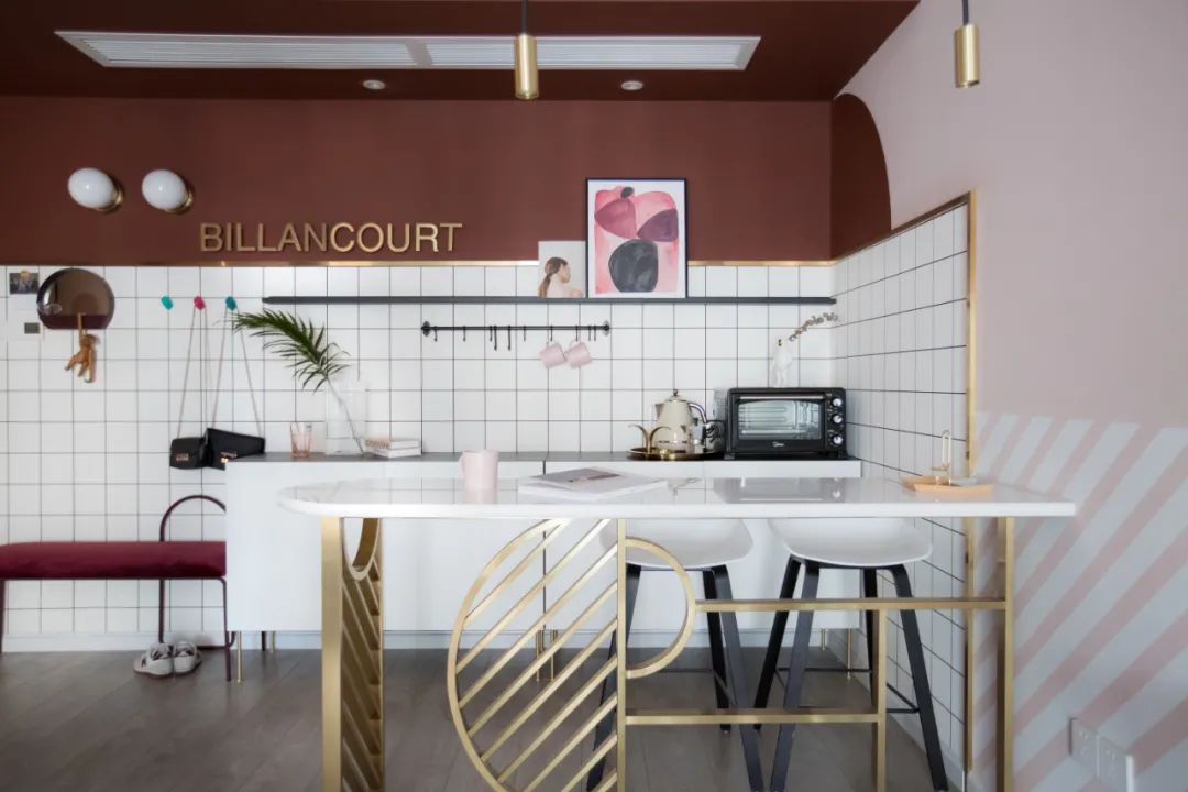 ● 是法式的直抵人心的浪漫,是簡約的人間煙火的溫暖,是跨越漫漫時間,也不會泯滅的家的品味和依戀。在紅色底片中加入金屬與黃銅打造精致感,白色瓷磚的加入平衡視覺感官,餐廳立體感自然形成。