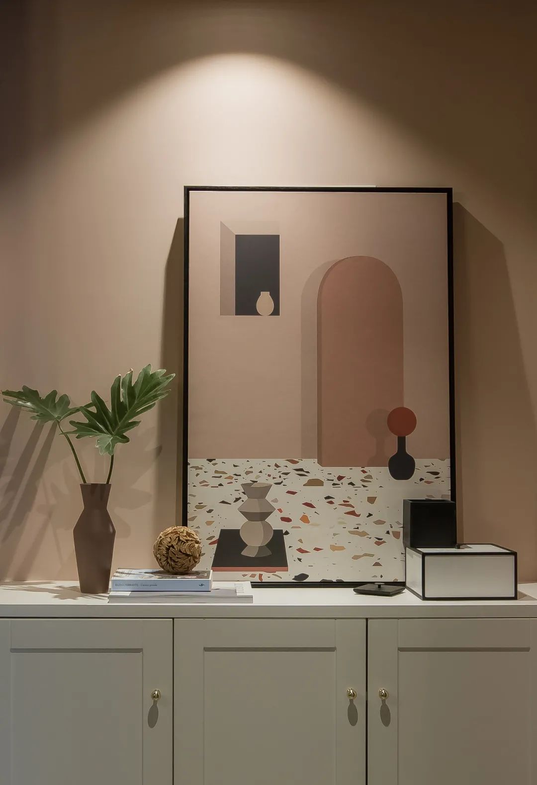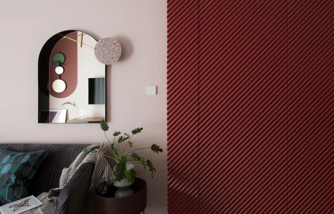● 好的設(shè)計是為生活賦趣,玄關(guān)由煙熏粉墻面與白色烤漆質(zhì)感墻柜組合,文藝感漫上心頭,在暖光燈的作用下,宛如一粒粒咖啡豆在玄關(guān)的"容器"里被精細萃取,馥郁的香氣四溢,安神又溫馨。