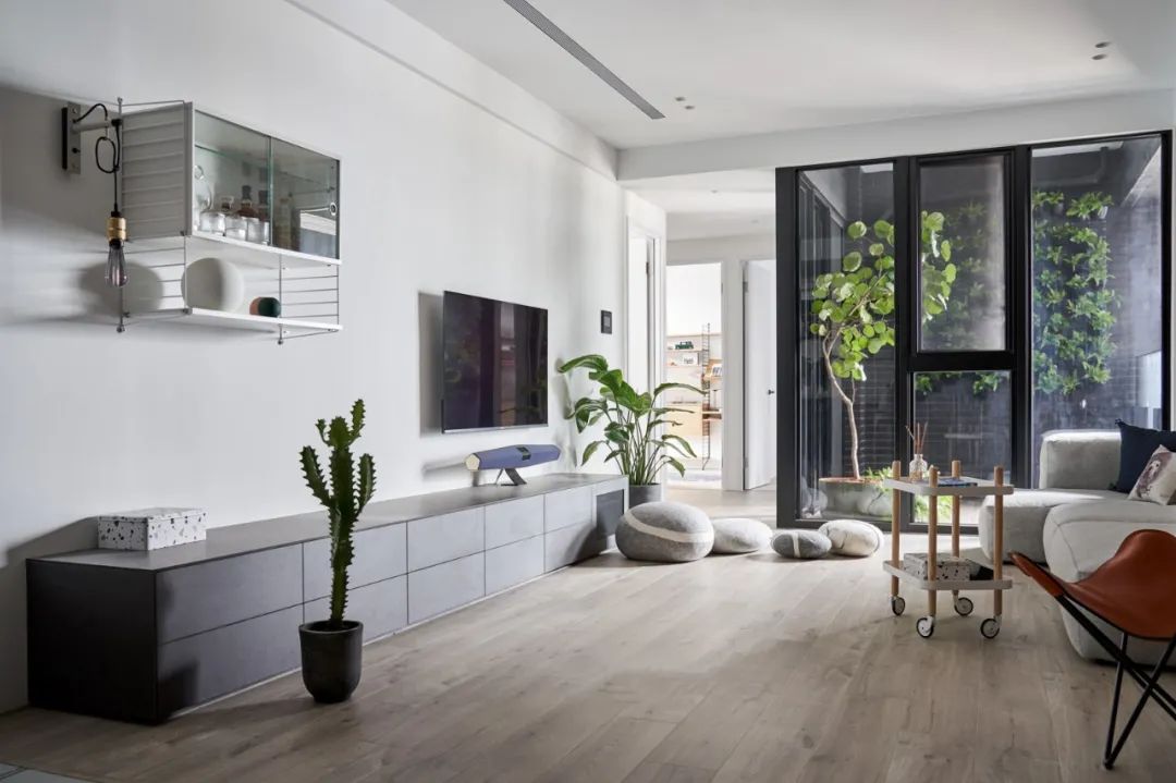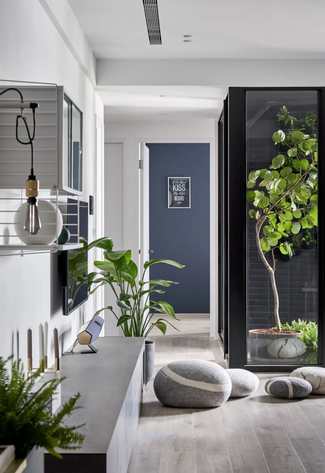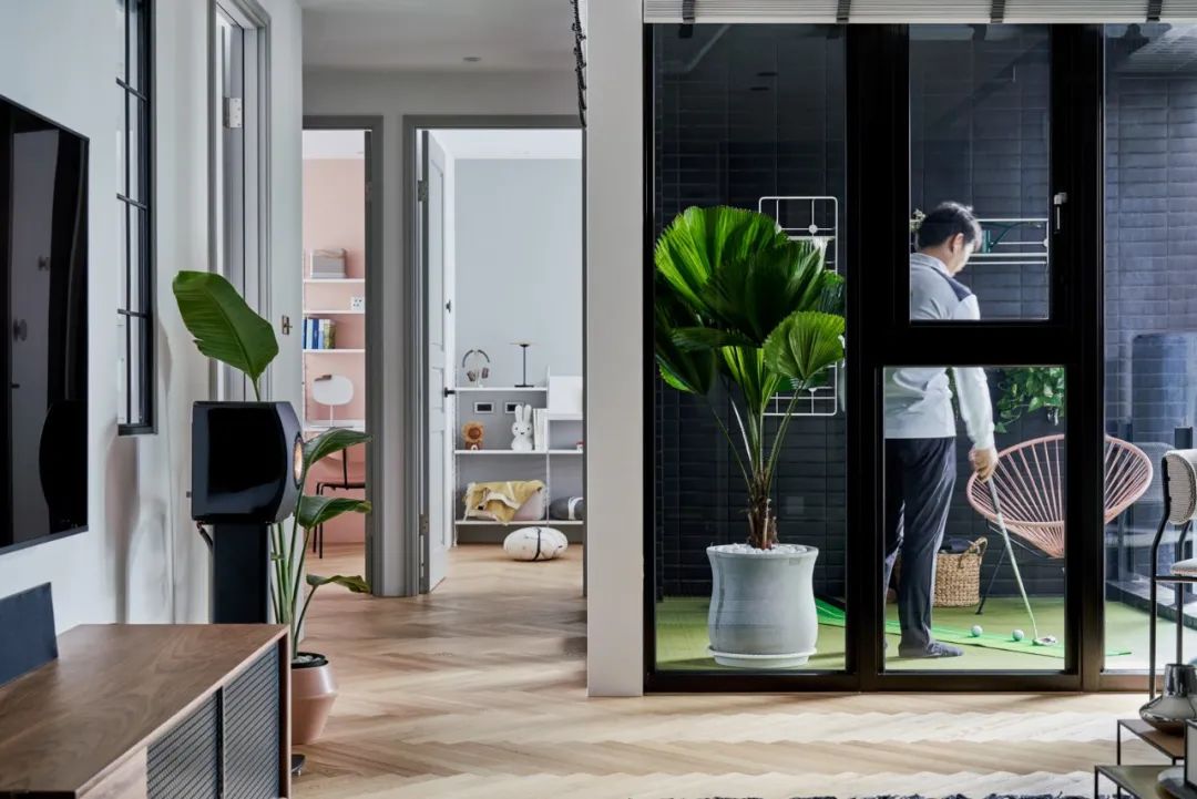 客廳左側(cè)劃分出一隅休閑室,黑磚為底,綠意充盈,自然氣息透過玻璃推拉門由內(nèi)往外散發(fā)。閑暇時(shí)可在這小坐打盹兒,或玩幾局室內(nèi)高爾夫,好生愜意。