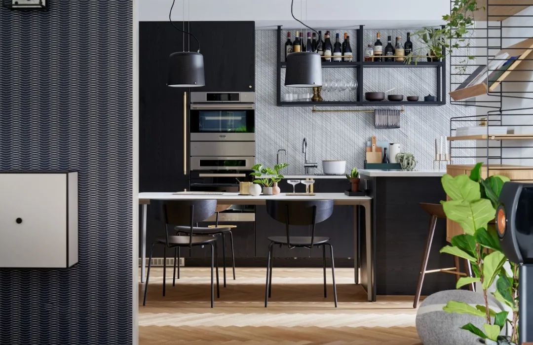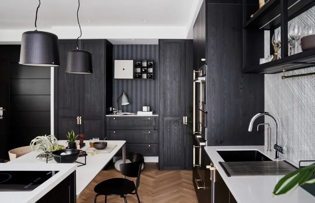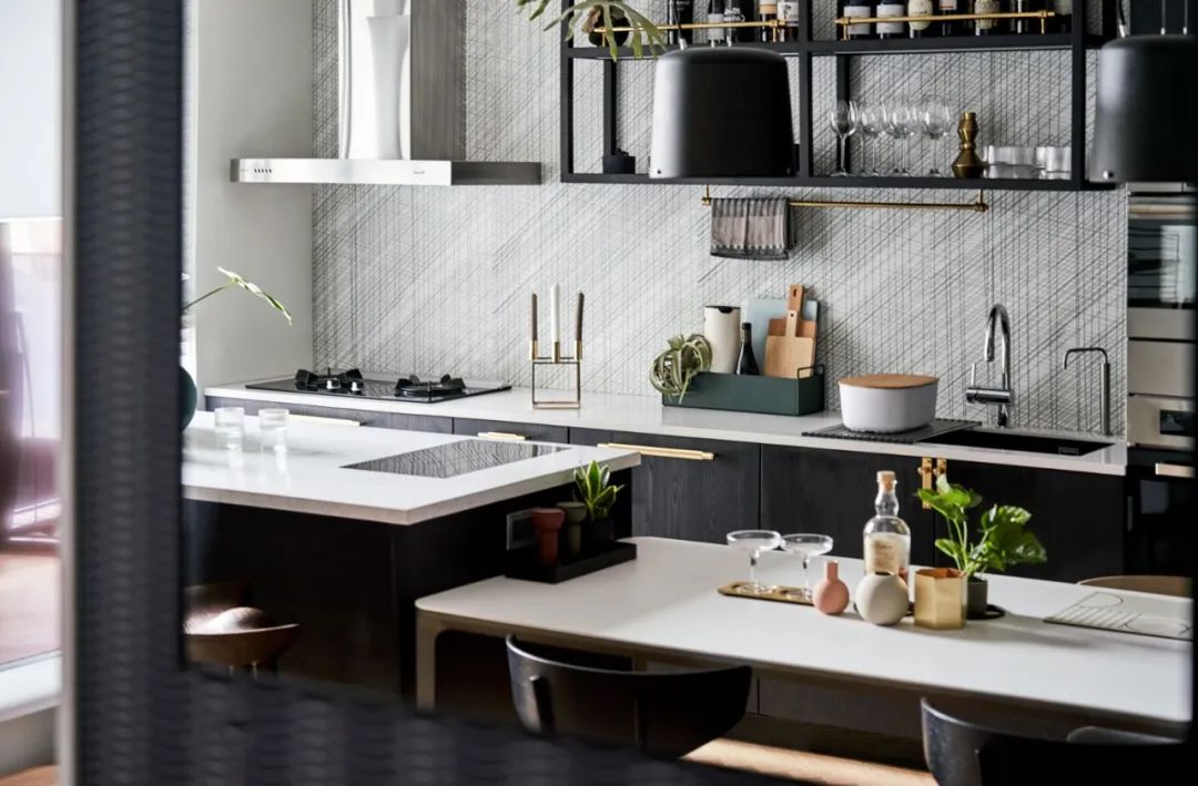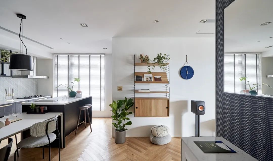 半開放式廚房擁有很好的采光功能,綠植點(diǎn)綴在黑白交疊的脈絡(luò)中更具生機(jī)。臺(tái)面秩序劃分功能區(qū),收納柜集立體感與實(shí)用性,至吊頂垂下可用于擺放調(diào)味品或裝飾品,讓女主人在烹飪時(shí)的"手忙腳亂"得以避免。