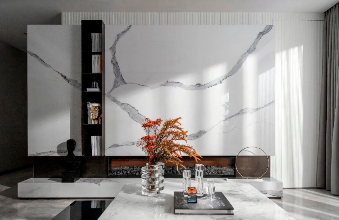 精心落筆的輪廓呈現(xiàn)奢華鏡像詩意與人間煙火兩相呼應(yīng),整面大理石作為客廳電視背景墻,品質(zhì)感直擊心靈,底部的火爐設(shè)計別具趣味,鏤空與挑高手法將客廳一隅襯托出藝術(shù)美感。