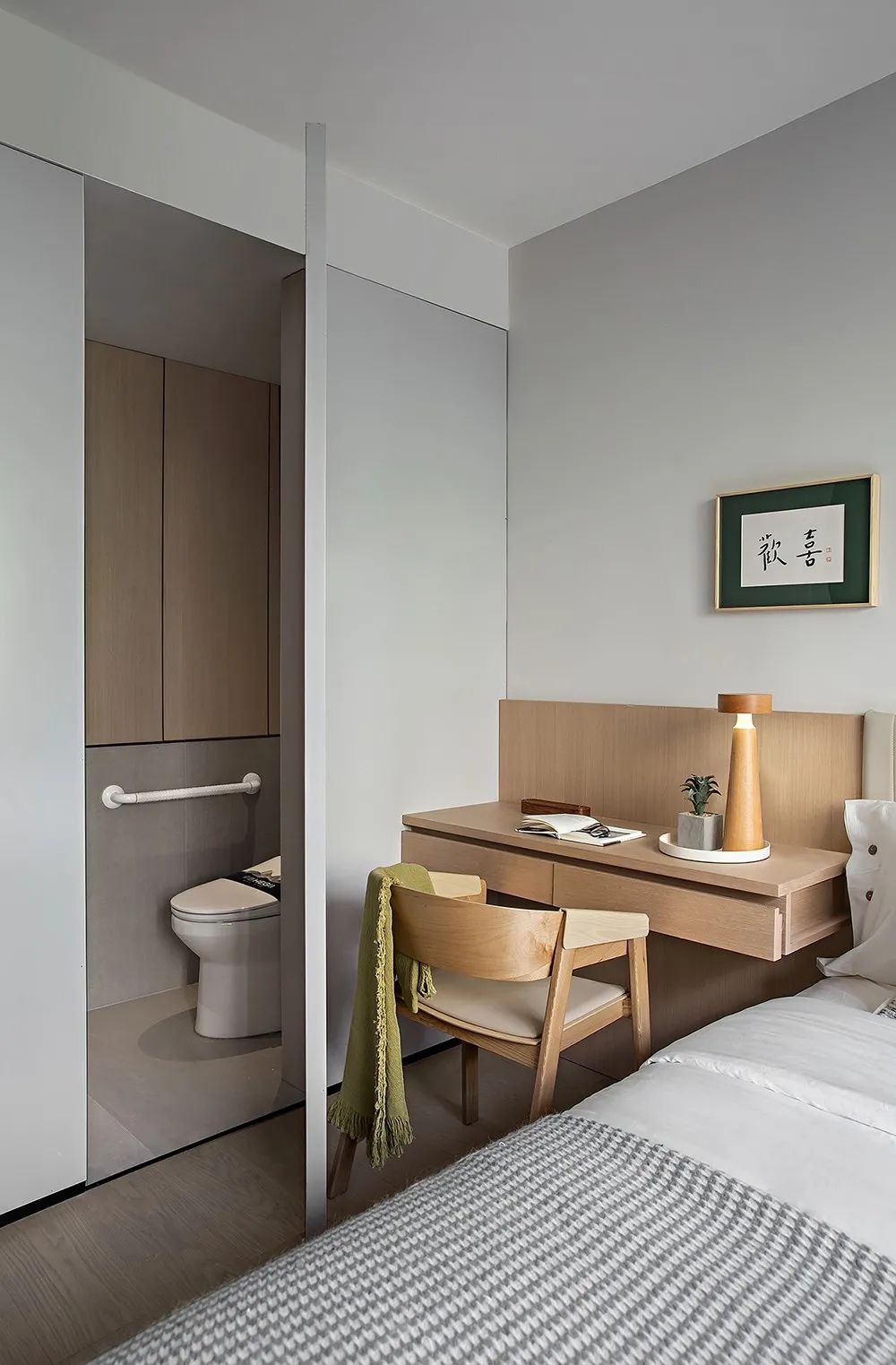 主臥一側(cè)不到2㎡設(shè)置出配套衛(wèi)生間,整體格調(diào)以高級灰為主大氣優(yōu)雅,衛(wèi)生間內(nèi)部墻面木質(zhì)隔層也可存放生活物件。