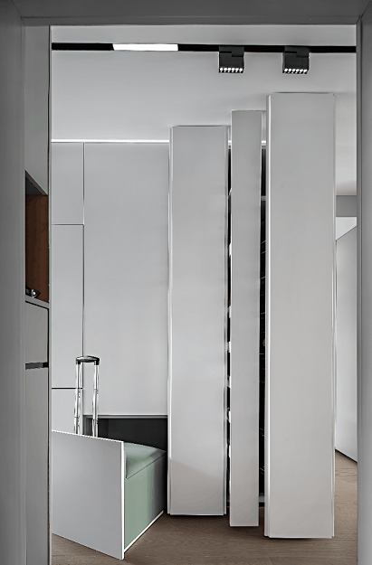 入戶玄關(guān)處柜體自帶鞋柜,下方正方形柜體可拉伸出換鞋凳,不用的時(shí)候隱藏起來也絲毫不占空間。