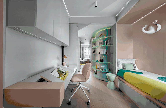 兒童房內(nèi)有書桌,鍛煉區(qū),書柜,床體下側(cè)由柜體組成,溫柔明亮的色調(diào)富有童趣。