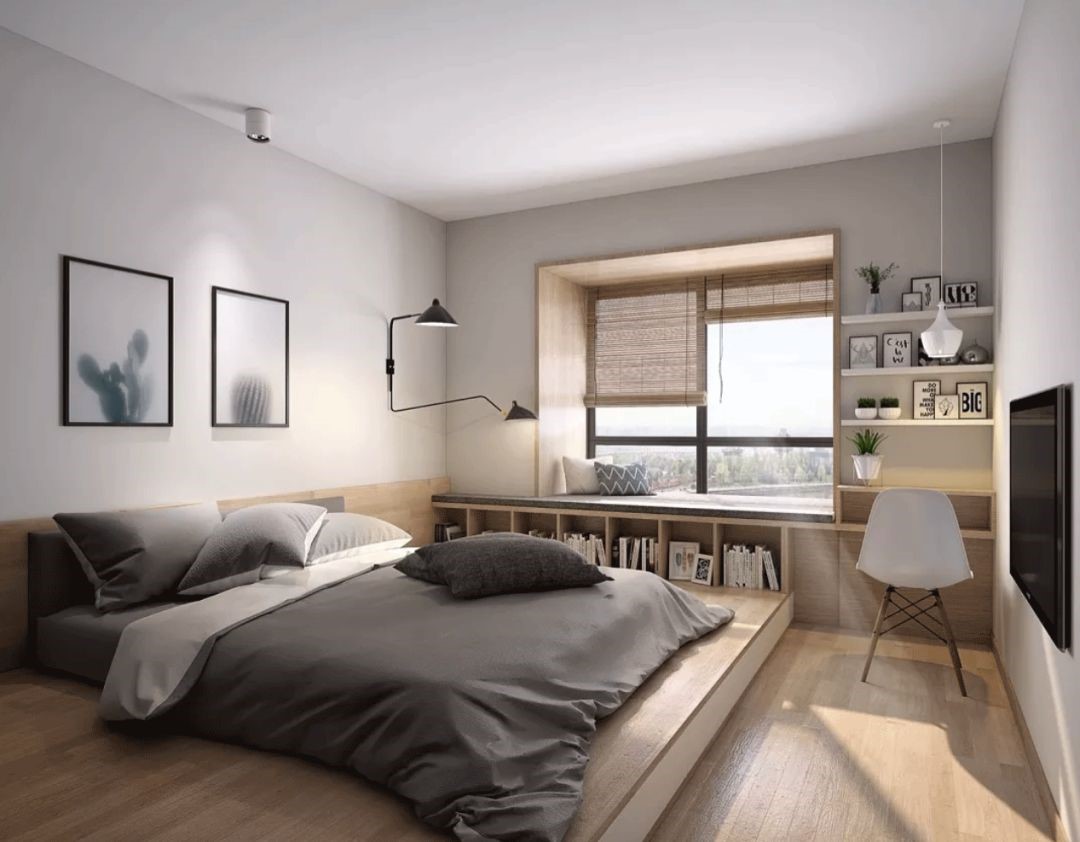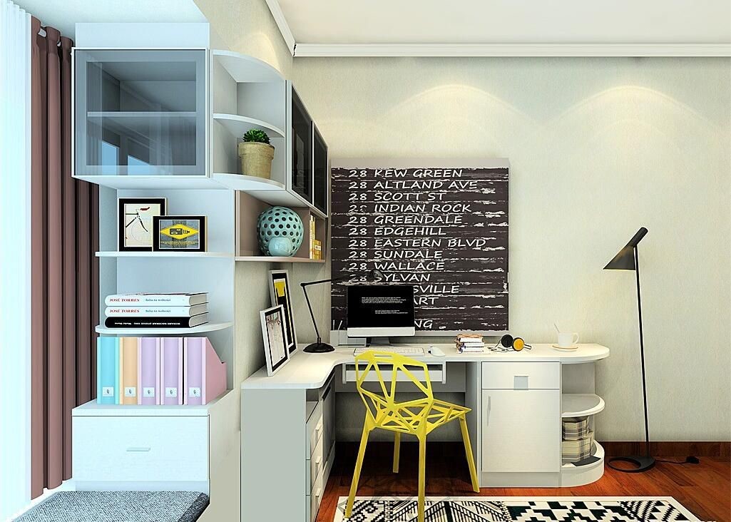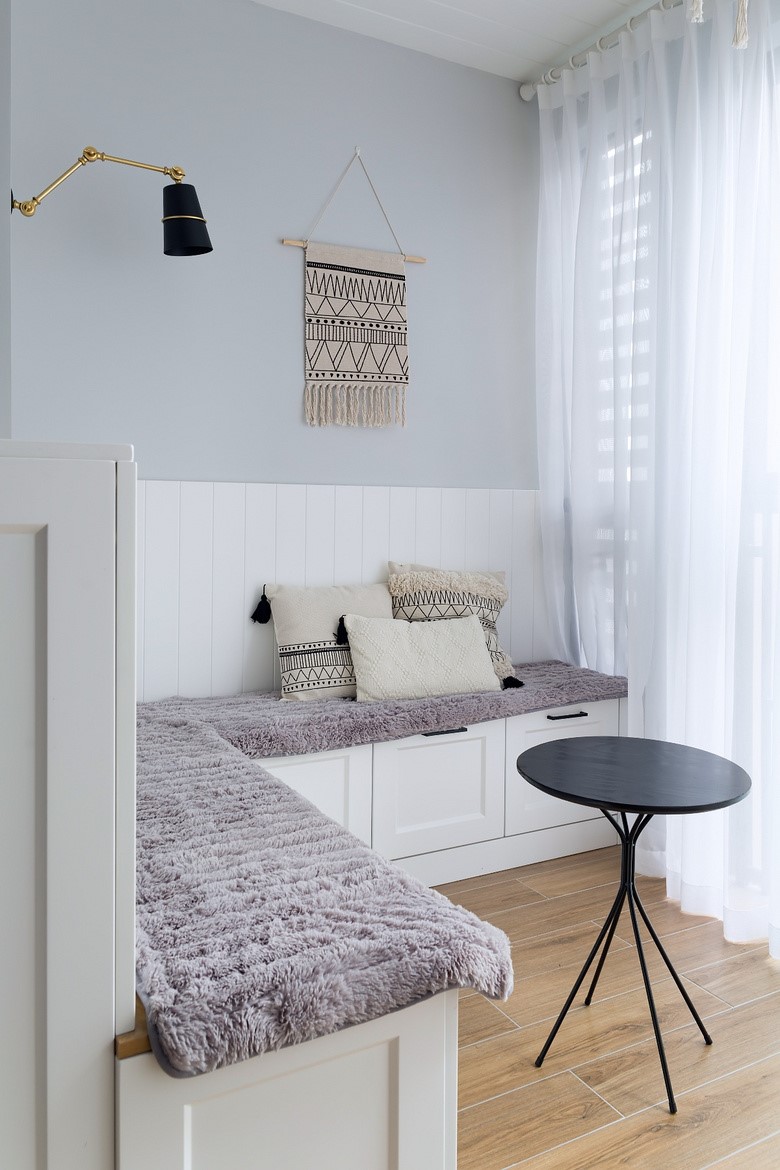 (備注:利用角落、墻壁設(shè)置柜子,即便有飄窗也不會(huì)突兀,如下圖所示)
