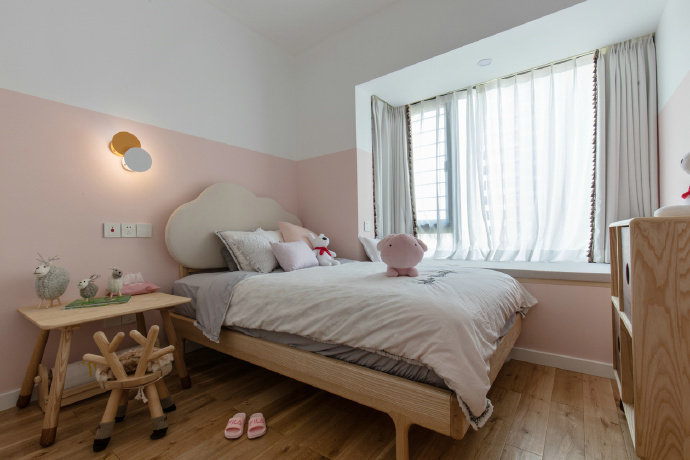 兒童房的布置與主臥不同,因為業(yè)主的孩子是個可愛的小女孩,為了照顧小仙女的喜好和風格,白色的墻面外又涂了一層粉色的乳膠漆,使房間更加可愛俏皮。床頭燈采用暖光LED等,保證照片的同時還不會刺激孩子的眼睛,保護孩子的視力。