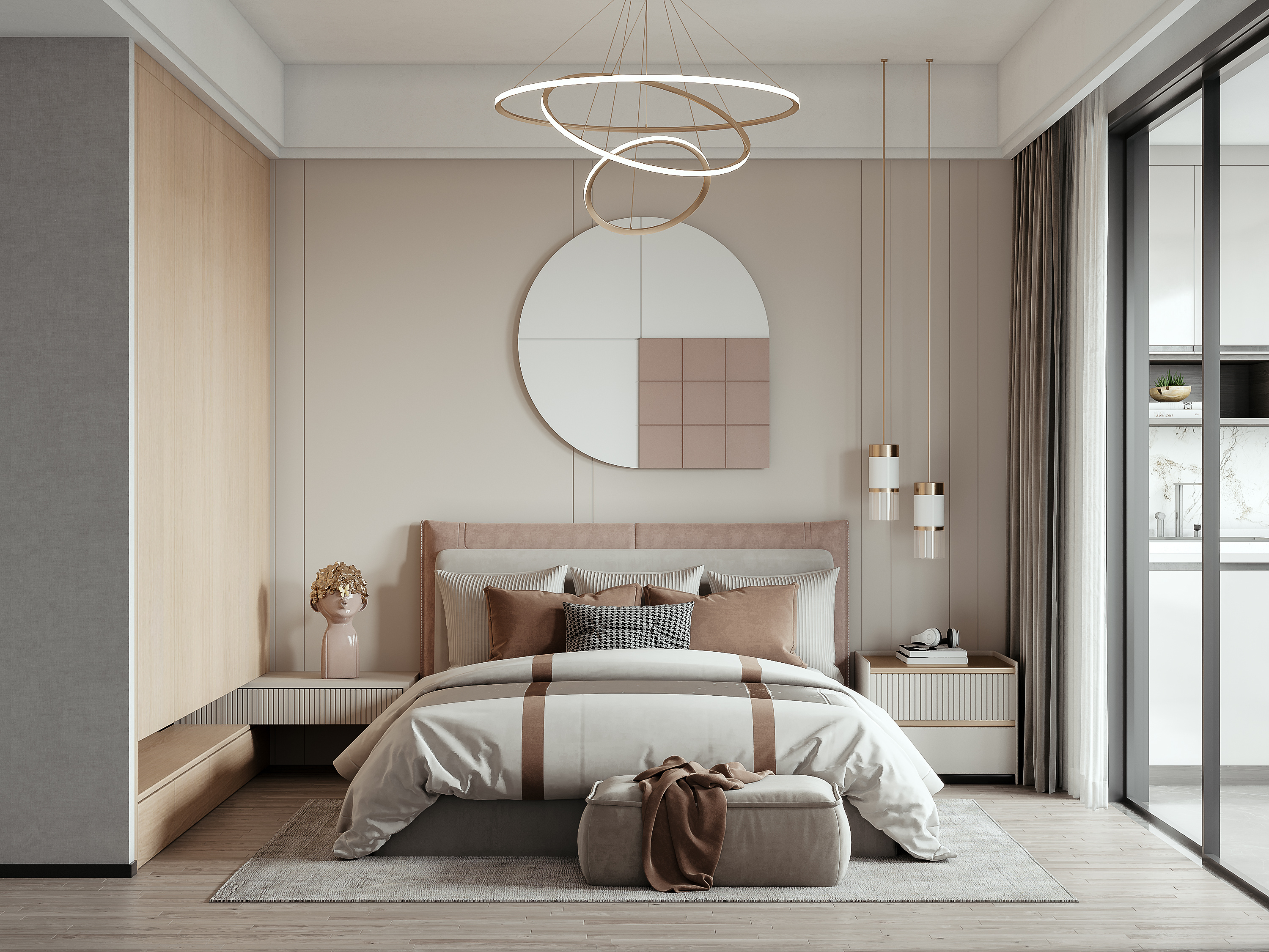 在墻壁裝修方面,使用了淺色的護墻板,并搭配上簡約的金屬線條,形成了一種現(xiàn)代感和奢華感兼?zhèn)涞男Ч?。墻上擺放了簡單的裝飾畫,增加了一些生活氣息。