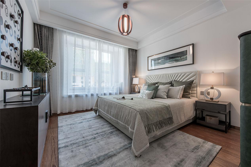 次臥床頭背景墻上掛著一幅寫意的畫作,灰色的地毯鋪在木地板上,增加了房間的層次。