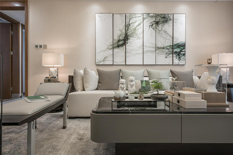 沙發(fā)旁角幾上擺放著優(yōu)雅的臺燈,材質(zhì)講究的茶幾上擺放著質(zhì)樸的茶具和擺件。