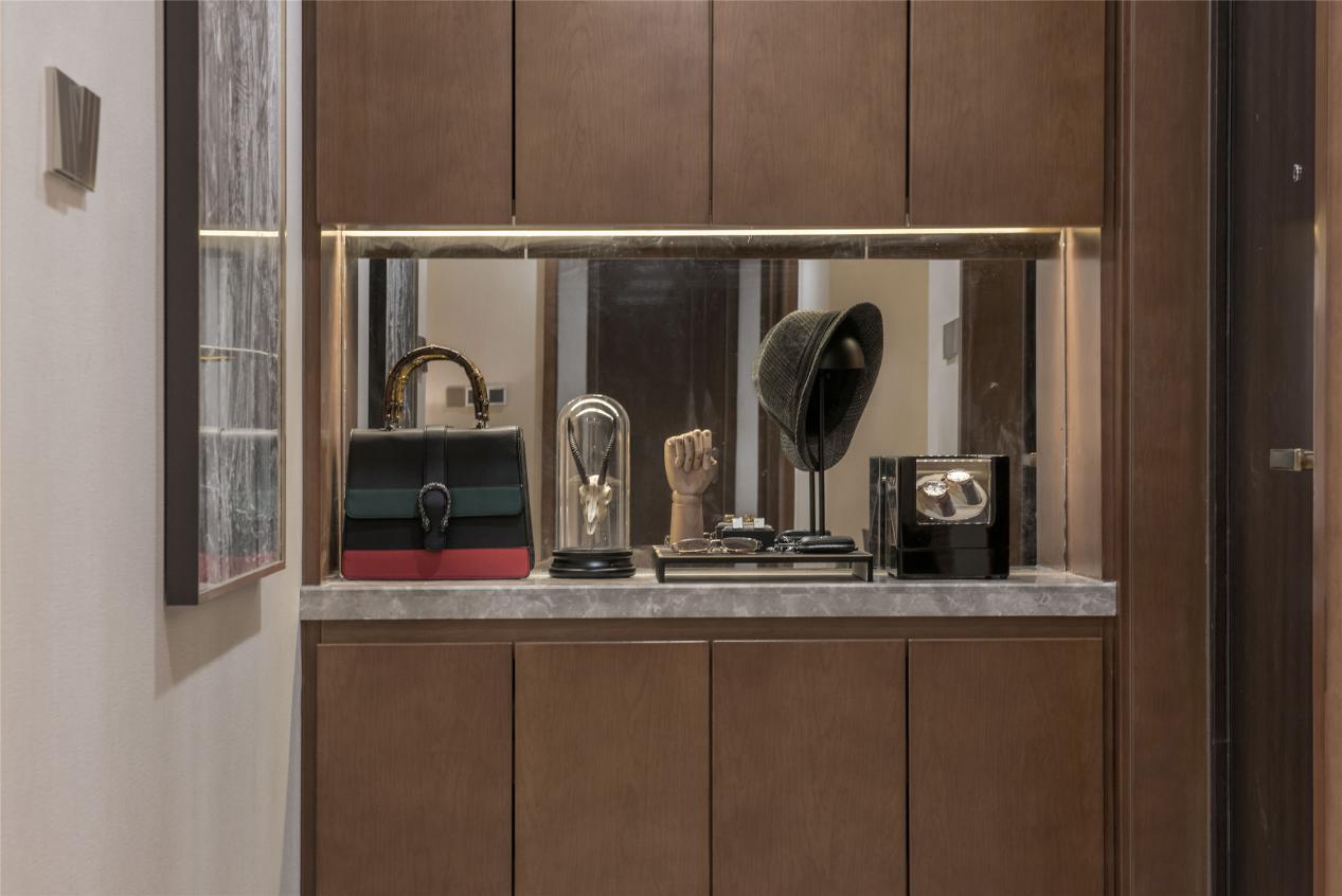 玄關(guān)質(zhì)樸大方的到頂壁柜不僅能擺放鞋子,臺面上還能擺放包包、帽子和擺件。
