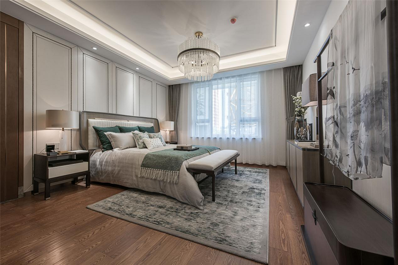 主臥寬大的床上鋪著舒適的床上用品,設(shè)計精巧的吊燈提升了整體的裝修檔次。