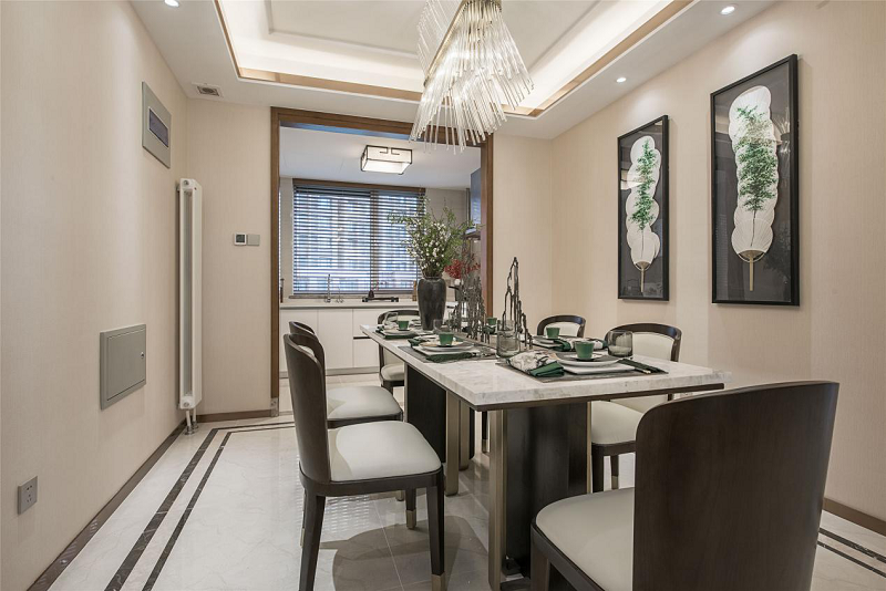 餐廳質(zhì)樸大方的餐桌搭配舒適的餐椅,墻上掛著兩幅掛件,設(shè)計精巧的吊燈懸掛在餐桌上方,散發(fā)著柔和的光線。